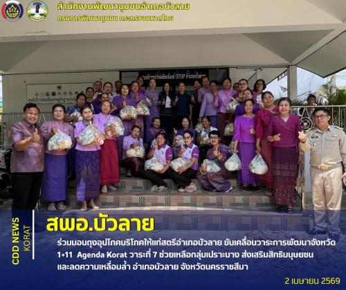 อำเภอบัวลาย จังหวัดนครราชสีมา โดย นางภัตติมา รุ่งพัฒนพันธ์ นายอำเภอบัวลาย พร้อมด้วย นางกนกรัชต์ วงษ์กาฬสินธุ์ พัฒนาการจังหวัดนครราชสีมา ดร.จุฑาสัณต์ ตั้งตรีวีระกุล ประธานคณะกรรมการพัฒนาสตรีอำเภอบัวลาย นางสาวปุญญิสา คำนาค ผู้อำนวยการกลุ่มงานส่งเสริมการพัฒนาชุมชน นายชาลี ชูชี พัฒนาการอำเภอบัวลาย ร่วมกันมอบถุงอุปโภคบริโภคให้แก่สตรีอำเภอบัวลายจำนวน 45 หมู่บ้าน เพื่อส่งต่อให้แก่ครัวเรือนยากจนในหมู่บ้าน ขับเคลื่อนวาระการพัฒนาจังหวัด 1+11 Agenda Korat วาระที่ 7 ช่วยเหลือกลุ่มเปราะบาง ส่งเสริมสิทธิมนุษยชนและลดความเหลื่อมล้ำ โดยกิจกรรมดังกล่าว เป็นกิจกรรมต่อเนื่องจากการดำเนินโครงการวันสตรีสากล อำเภอบัวลาย ประจำปี 2569 ซึ่งได้ร่วมกันทำบุญตักบาตร เพื่อช่วยเหลือครัวเรือนยากจน/เปราะบางในพื้นที่อำเภอบัวลาย ซึ่งคณะกรรมการพัฒนาสตรีอำเภอบัวลาย ได้ดำเนินกิจกรรมดังกล่าวมาอย่างต่อเนื่อง เพื่อส่งเสริมและช่วยเหลือสตรีที่ได้มีความเดือดร้อน ซึ่งมีกลุ่มเป้าหมายจาก 45 หมู่บ้านของอำเภอบัวลายได้รับประโยชน์จากกิจกรรมดังกล่าว