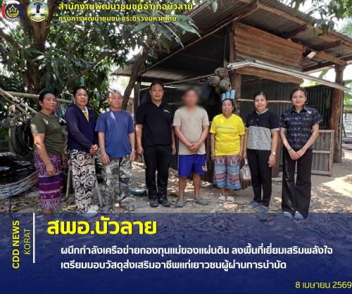 อำเภอบัวลาย โดย สำนักงานพัฒนาชุมชนอำเภอบัวลาย นำโดย นายชาลี ชูชี พัฒนาการอำเภอบัวลาย พร้อมด้วย นางสาวชลธิชา สงหมื่นไวย์ นักวิชาการพัฒนาชุมชนปฏิบัติการ และนางสาวไพจิตร ไปไหน ผู้ใหญ่บ้านบ้านหนองกุงพัฒนา หมู่ที่ 13 ตำโนนจาน อำเภอบัวลาย จังหวัดนครราชสีมา ลงพื้นที่ติดตามครัวเรือนเป้าหมาย ณ บ้านหนองกุงพัฒนา หมู่ที่ 13 ตำบลโนนจาน อำเภอบัวลาย จังหวัดนครราชสีมา จำนวน 1 ครัวเรือน เพื่อติดตามความพร้อม และให้กำลังใจครัวเรือนเป้าหมาย เตรียมมอบวัสดุสนับสนุนการประกอบอาชีพให้แก่เยาวชนกลุ่มเสี่ยงและผู้ผ่านการบำบัด มุ่งสร้างโอกาส สร้างรายได้ และคืนคนดีสู่ชุมชนอย่างยั่งยืน